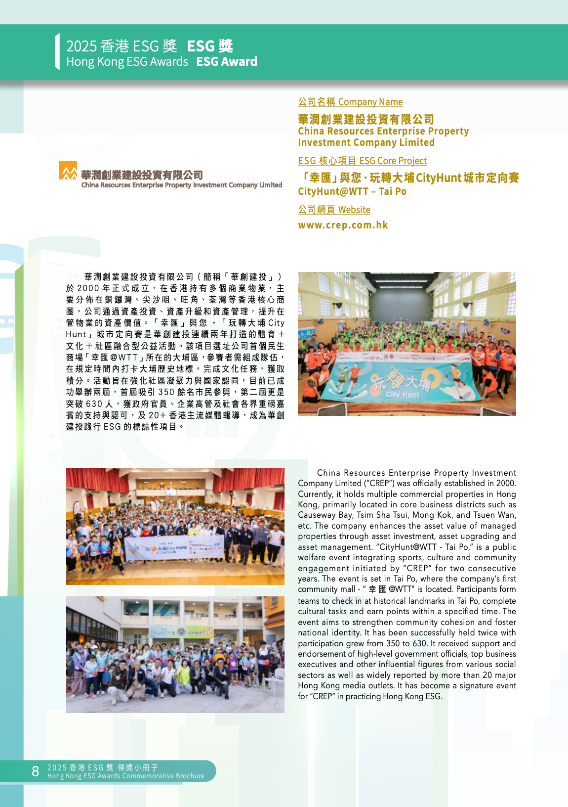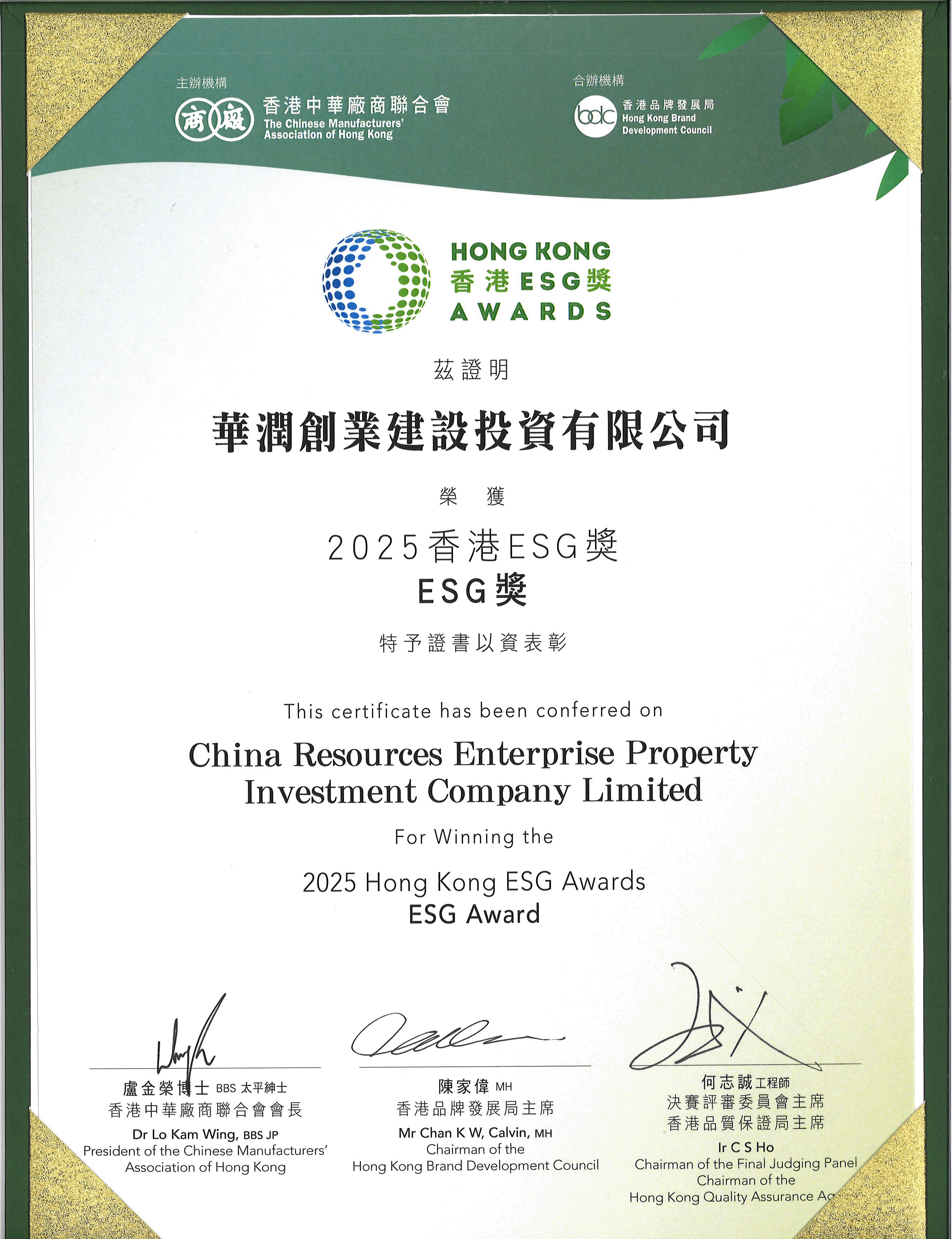 10月17日,由香港中华厂商联合会主办的2025“香港ESG奖”暨“ESG约章”颁授典礼在香港会议展览中心隆重举行。华润创业建设投资有限公司凭借社区项目“幸汇与您·玩转大埔CityHunt城市定向赛”荣获“香港ESG奖”,并获颁“ESG约章”证书。颁奖典礼上,香港特区政府署理财政司司长黄伟纶, GBS, JP及香港中华厂商联合会会长卢金荣博士, BBS, JP共同向华创建投颁发嘉许认证。